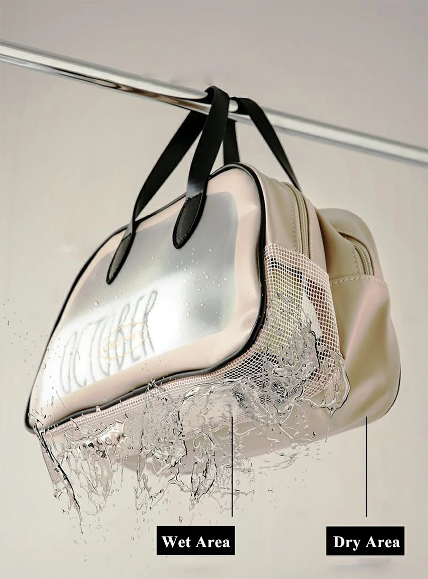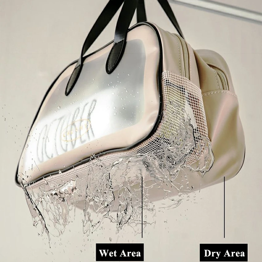 1. This bag is made of good quality PVC material, there are 2 compartments in the bag, one is for wet area, for towel and wet close, it is with good ventilation that avoids mold. Another part is dry area, water-proof and easy cleaning