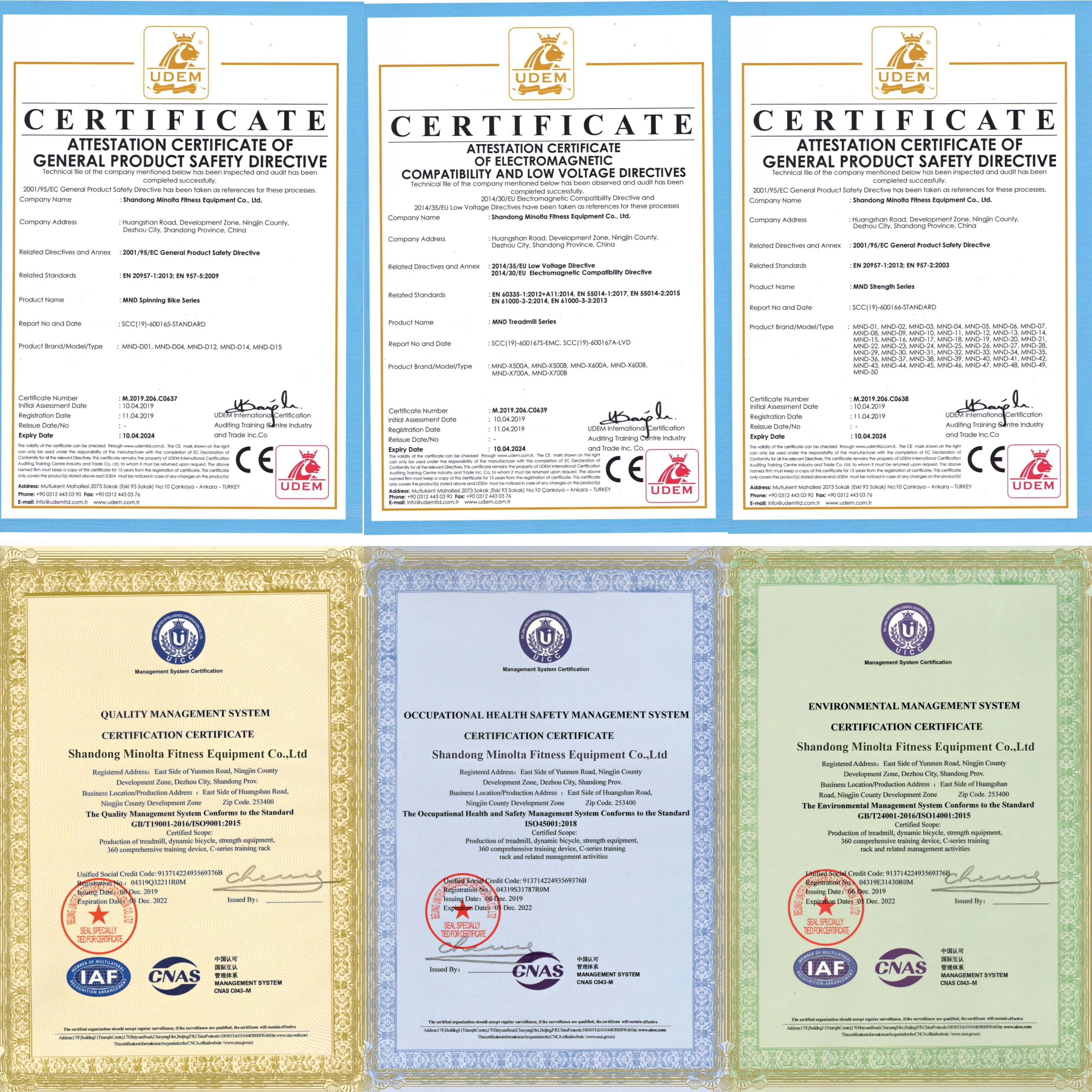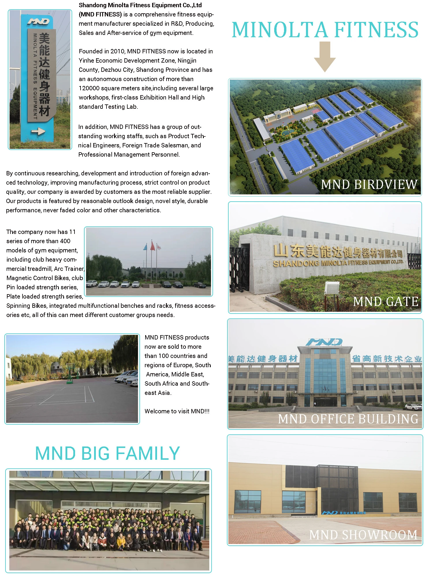 Minolta Fitness Equipment Co.,Ltd. is a comprehensive fitness equipment manufacturer specialized in R&D, Producing, Sales and After-service of gym equipment. Founded in 2010, it has a group of outstanding Product Technical Engineers, by continuous researching, development and improving manufacturing process, strict control on product quality, our company is awarded by customers as the most reliable supplier. Our products is featured by reasonable outlook design, novel style, durable performance, never faded color and other characteristics. The company now has 10 series of more than 300 models of fitness equipment, including club heavy commercial use treadmill, self-powered treadmill and club dedicated strength series, exercise bikes, integrated multifunctional frame and racks, fitness accessories etc, all of these can meet different customer groups need. MND FITNESS products now are exported to more than 100 countries and regions, such as Europe, South America, Middle East, South Africa and Southeast Asia countries. all products with CE and RoHs Certifications. You would be warmly welcomed to our factory to check all products quality.